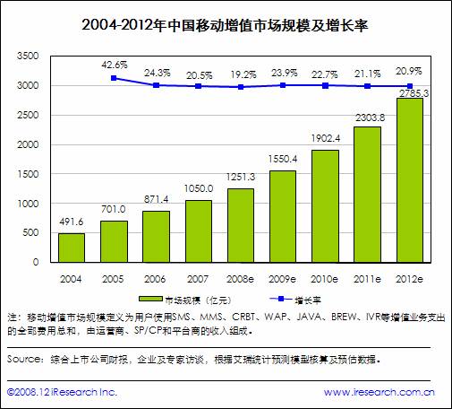 根據(jù)iResearch艾瑞咨詢即將推出的《2008-2009年中國移動(dòng)互聯(lián)網(wǎng)行業(yè)發(fā)展報(bào)告》統(tǒng)計(jì),2008年中國移動(dòng)增值市場(chǎng)規(guī)模達(dá)1251.3億人民幣(約合183.2億美元),相比2007年的1050億人民幣年同比僅增長(zhǎng)19.2%,相比2007年增速放緩。(中國移動(dòng)增值市場(chǎng)規(guī)模定義為用戶為各項(xiàng)移動(dòng)增值業(yè)務(wù)付費(fèi)總和)