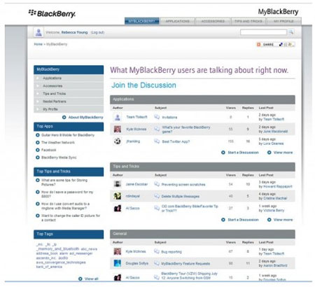 從某種程度而言,MyBlackBerry并不是一個真正的社交網(wǎng)站,而更像一個用戶留言板。網(wǎng)站具有一定的針對性,允許使用同型號設(shè)備的用戶進行交流。例如,使用BlackBerry Storm的用戶可以與其他Storm用戶聊天或共享信息。