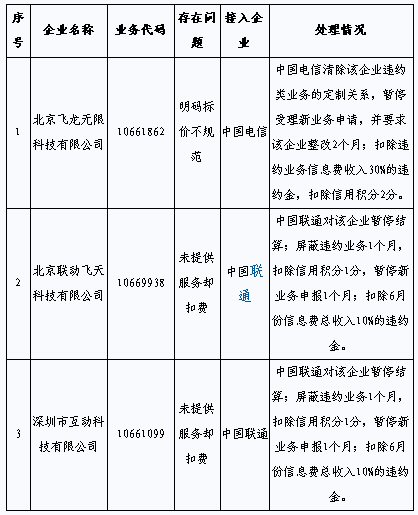 據(jù)悉,這3家增值電信企業(yè)是北京飛龍無限科技有限公司,存在明碼標(biāo)價(jià)不規(guī)范問題;北京聯(lián)動飛天科技有限公司,未提供服務(wù)卻扣費(fèi);深圳市互動科技有限公司,未提供服務(wù)卻扣費(fèi)。