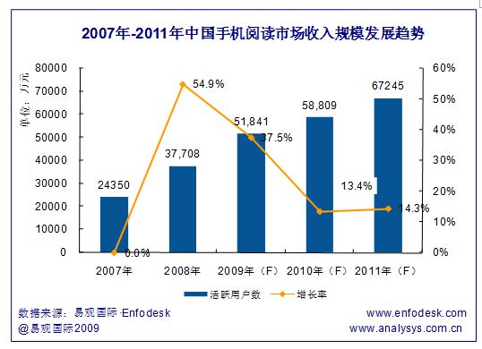 盈利模式日漸清晰。用戶付費(fèi)意愿的不斷增強(qiáng)、廣告盈利模式及多版權(quán)運(yùn)營等盈利模式的成熟,手機(jī)閱讀市場(chǎng)收入規(guī)模將不斷攀升。預(yù)計(jì)2010年,中國手機(jī)閱讀市場(chǎng)營收將達(dá)到5.9億元,甚至更多,年增長(zhǎng)率將達(dá)到13.4%。