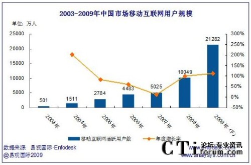 2009年移動互聯(lián)網(wǎng)用戶將超2億,與2008年的1.005億用戶數(shù)相比,年增長率達(dá)111.78%。用戶數(shù)量增長的同事,移動互聯(lián)網(wǎng)用戶主動需求也日趨旺盛,尤其表現(xiàn)在手機(jī)網(wǎng)游、手機(jī)閱讀、手機(jī)證券、移動微博等細(xì)分領(lǐng)域方面,用戶多樣化需求也間接引導(dǎo)移動互聯(lián)網(wǎng)應(yīng)用服務(wù)的快速發(fā)展。