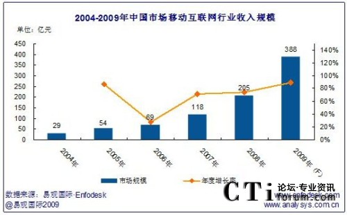 2009年中國市場移動互聯(lián)網(wǎng)行業(yè)收入規(guī)模將達(dá)388億,年增長率達(dá)111.78%。