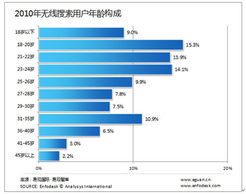 據Enfodesk易觀智庫近期發(fā)布的研究表明:中國無線搜索市場用戶結構在2010年已經發(fā)生巨大變化。對比2009年數據來看,無線搜素用戶在性別、年齡、職業(yè)分布方面,已經發(fā)生快速的變化。