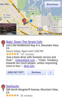 谷歌更新了移動搜索用戶界面。用戶移動設備屏幕的下方增添了諸如餐館、咖啡店、酒吧等圖標,并增添了一個“更多”的圖標。如果用戶點擊這些圖標,可以查詢用戶所在地的各種商店的信息。而且這些商店的營業(yè)場所還將會在地圖上顯示出來。