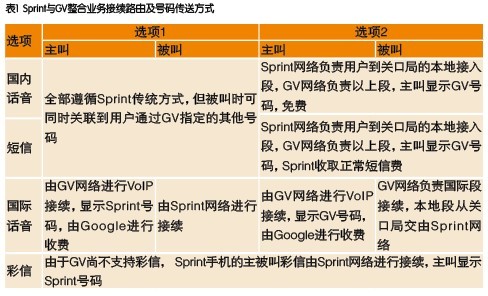 選項2中,話音和短信業(yè)務都交由GV網(wǎng)絡進行接續(xù),Sprint只負責用戶到關口局的本地接入段,這時候使用的是GV的VoIP業(yè)務。因此,選項2才可以稱得上是深度整合;同時,由于GV使用的是固網(wǎng)碼號,雙方的整合其實已經(jīng)屬于FMC的范疇了。表1是對上述兩種方式的具體分析。