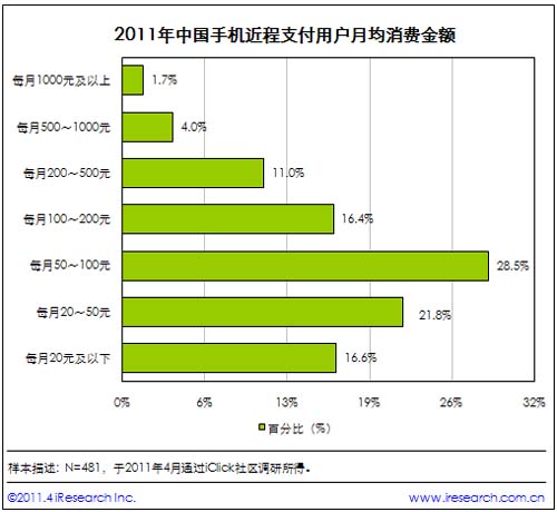 根據(jù)艾瑞咨詢近期發(fā)布的《2011年中國新興線下支付行業(yè)研究報(bào)告》的研究數(shù)據(jù)顯示,中國手機(jī)支付發(fā)生的場(chǎng)景主要集中在超市、便利店和商場(chǎng)等場(chǎng)所;并且,目前的中國用戶的手機(jī)支付金額,都以100元及以下的小額支付為主。