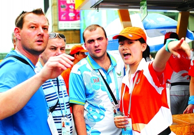 8月22日,深圳華強路大運“U”站的志愿者在工作。