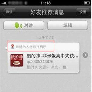 最近,網(wǎng)絡(luò)上流傳著這樣一幅截圖:一家叫“餓的神”的快餐店在午間向附近的人打招呼,以宣傳自己的快餐生意,乍一看這種形式,簡(jiǎn)直是超越了空間的電子傳單啊。看來微信這種交友利器,已經(jīng)突破了傳統(tǒng)交流工具的定義,開始向更寬的領(lǐng)域延伸。