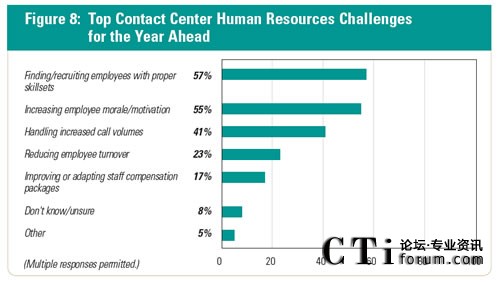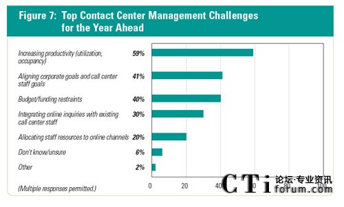 73%的公司表示,呼叫中心是公司面向客戶的窗口。 57%的呼叫中心管理者正在經(jīng)歷答疑或保持員工在中心擁有合適的技能。此外,41%的人表示,處理增加的呼叫量是呼叫中心未來(lái)一年面臨的主要挑戰(zhàn)。 59%的公司表示,未來(lái)一年的面臨的主要挑戰(zhàn)是生產(chǎn)效率。