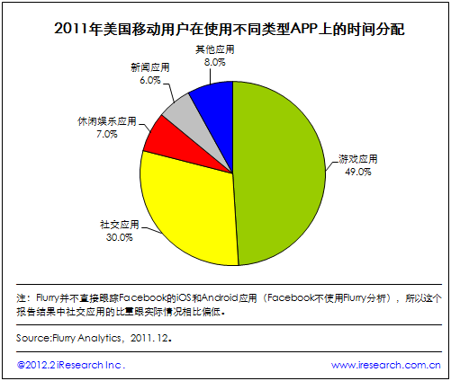 iResearch艾瑞咨詢整理Flurry最新的研究數(shù)據(jù)發(fā)現(xiàn),2011年美國移動用戶花在游戲應用上的時間最長,游戲應用占據(jù)美國移動用戶應用使用總時間的49.0%,其次是社交網(wǎng)絡(luò)應用,占30.0%,休閑娛樂應用和新聞類應用分別為7.0%和6.0%,剩下的其他類型應用占據(jù)8.0%。