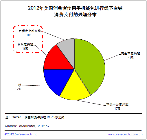 iResearch艾瑞咨詢整理eMarketer調(diào)查數(shù)據(jù)發(fā)現(xiàn),盡管手機支付市場增速迅猛,但其在美國消費者中的接受程度相對較低。數(shù)據(jù)顯示,被調(diào)查者中只有1/4的美國用戶對使用手機錢包在線下店鋪消費感興趣,而相比之下,58%的消費者對手機錢包技術不感興趣,其中包括41%的人完全沒興趣。