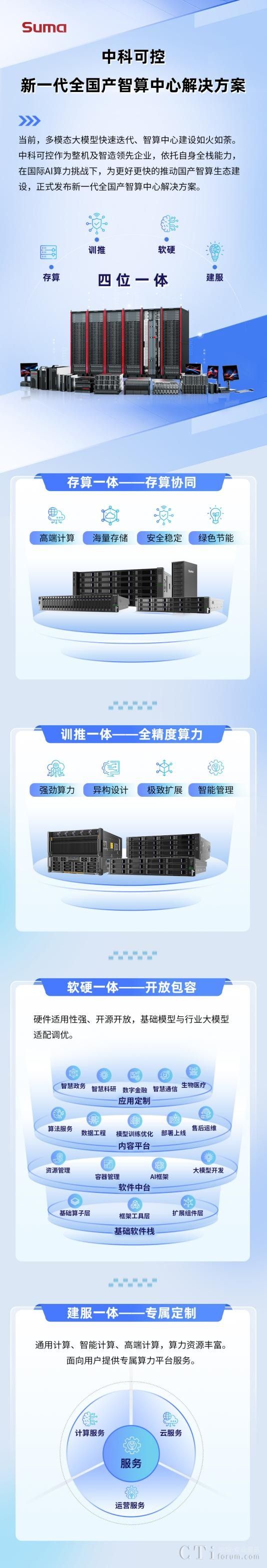 作為整機及智造領先企業(yè),中科可控一直堅持國產(chǎn)自主路線,結(jié)合當下行業(yè)對于AI技術(shù)的需求,在原有通用解決方案的基礎上,全面推出新一代全國產(chǎn)智算中心解決方案。該方案通過“存算+訓推+軟硬+建服”四位一體的理念,推動國產(chǎn)智算生態(tài)建設,賦能千行百業(yè)數(shù)智化轉(zhuǎn)型。