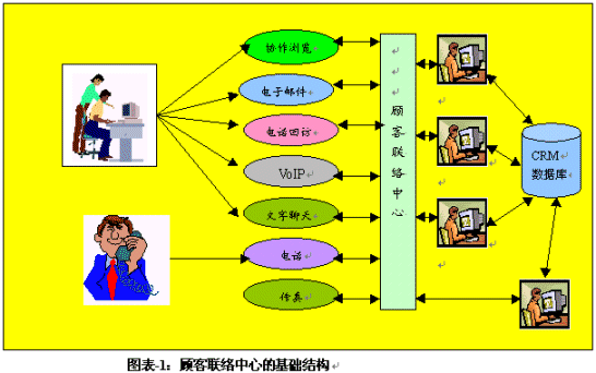 。。呼叫中心通過(guò)多年以來(lái)的發(fā)展,其傳統(tǒng)型的呼叫中心還是主要在以電話為媒介服務(wù)于顧客。這類(lèi)呼叫中心的基礎(chǔ)結(jié)構(gòu)包括ACD、IVR、CTI等技術(shù)應(yīng)用平臺(tái)和界面,同時(shí)與企業(yè)的后臺(tái)資源相連接,例如大型或相關(guān)數(shù)據(jù)庫(kù)。但是,當(dāng)今的呼叫中心已經(jīng)發(fā)展成為一個(gè)多媒體的服務(wù)或交易渠道,有的還能處理基于互聯(lián)網(wǎng)的垂詢(xún)和呼叫,而有的則是一個(gè)虛擬的顧客聯(lián)絡(luò)中心,例如圖表-1中描述的那樣: