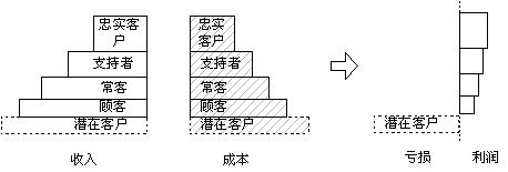 從圖中可以很清楚的看出客戶管理工作的內(nèi)容:層次寬度(每個(gè)層次客戶的數(shù)量)和層次的高度(每個(gè)層次客戶的平均贏利水平)。