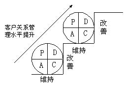 PDCA在質(zhì)量管理中得到了廣泛的應(yīng)用,成為“質(zhì)量改進(jìn)”一個(gè)不可缺少的工具,其實(shí)PDCA是對(duì)持續(xù)改進(jìn)、螺旋式上升工作的一種科學(xué)的總結(jié),可以廣泛的應(yīng)用于企業(yè)管理工作,包括客戶關(guān)系管理。如果說(shuō)前面提出客戶階梯、設(shè)置客戶關(guān)系管理的考核指標(biāo)可以方便的作為PDCA環(huán)的A中的工作目標(biāo),那么“三級(jí)關(guān)系營(yíng)銷”作為實(shí)現(xiàn)這個(gè)目標(biāo)的重要方法就成為D的重要內(nèi)