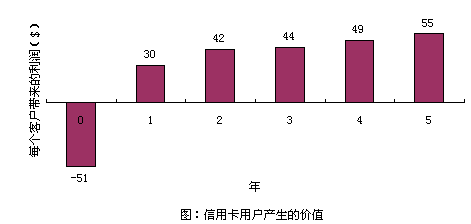 以信用卡服務(wù)為例,爭取一個新的用戶平均要51美圓,用于廣告、推銷和開戶等開支。用戶開始時花錢很少,但為公司帶來一定的利潤。但如果用戶繼續(xù)使用到第二年,就會為公司帶來更多的經(jīng)濟(jì)效益,因為公司與客戶之間的信任和客戶對公司的滿意,致使客戶更多地通過信用卡消費。(圖:"信用卡用戶產(chǎn)生的價值")用戶貢獻(xiàn)在增加,公司的運(yùn)作費用卻在不斷減低。信用卡公司可以不斷減少對客戶信用的審核時間。保持長期的客戶關(guān)系,還可以減少廣告支出,客戶本身就是一個免費的廣告資源。很多人在消費前喜歡聽取朋友的意見,覺得比廣告更可信。