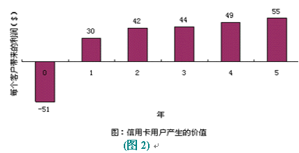 以信用卡服務(wù)為例,爭(zhēng)取一個(gè)新的用戶平均要51美圓,用于廣告、推銷和開戶等開支。用戶開始時(shí)花錢很少,但為公司帶來(lái)一定的利潤(rùn)。但如果用戶繼續(xù)使用到第二年,就會(huì)為公司帶來(lái)更多的經(jīng)濟(jì)效益,因?yàn)楣九c客戶之間的信任和客戶對(duì)公司的滿意,致使客戶更多地通過(guò)信用卡消費(fèi)。(圖:"信用卡用戶產(chǎn)生的價(jià)值")用戶貢獻(xiàn)在增加,公司的運(yùn)作費(fèi)用卻在不斷減低。信用卡公司可以不斷減少對(duì)客戶信用的審核時(shí)間。保持長(zhǎng)期的客戶關(guān)系,還可以減少?gòu)V告支出,客戶本身就是一個(gè)免費(fèi)的廣告資源。很多人在消費(fèi)前喜歡聽取朋友的意見,覺得比廣告更可信。