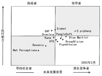 Siebel 和Oracle因?yàn)樵谄銫RM中整合了E-Marketing以及公司強(qiáng)大的資金實(shí)力,因此在挑戰(zhàn)者中最為引人注目。預(yù)計(jì)Siebel 將在6到12個(gè)月內(nèi)進(jìn)入E-Marketing市場(chǎng)的領(lǐng)導(dǎo)者行列。SAP首次出現(xiàn)在這一群體之中,但是它的強(qiáng)項(xiàng)在于其產(chǎn)品易于與已安裝的其它軟件相集成,而不是其E-Marketing的功能,這一點(diǎn)限制了那些沒(méi)有購(gòu)買(mǎi)過(guò)SAP產(chǎn)品的企業(yè)接受其產(chǎn)品。