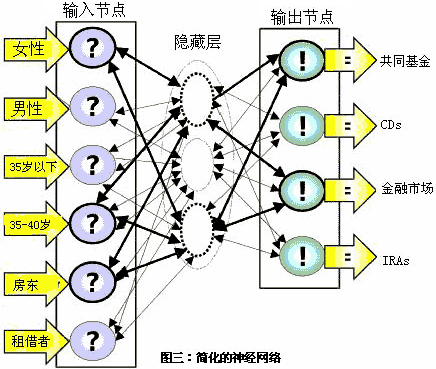 假設(shè)該集團(tuán)的數(shù)據(jù)組包括了100000個(gè)現(xiàn)有和潛在的顧客。數(shù)據(jù)組中所有成員至少滿足一個(gè)列示于每個(gè)輸出節(jié)點(diǎn)邊上的特征條件,比如說(shuō),他們的年齡小于35歲或者是在35-40之間,男性或者女性,房東或者租借人。BPN從所有的輸入節(jié)點(diǎn)中獲得數(shù)據(jù),并且以此編譯一個(gè)預(yù)測(cè)型模型。這個(gè)簡(jiǎn)單的模型告訴使用者,年齡在35-40歲之間的男性房東最有可能購(gòu)買共同基金和金融市場(chǎng)產(chǎn)品。這是BNP能預(yù)測(cè)的信息。