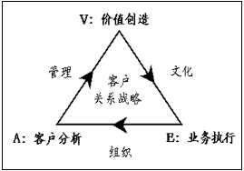 在全球CRM最佳實踐中有一種被稱作CRM"魔三角"的原理,備受企業(yè)的青睞。如下圖所示,構成三角形三個頂點的,分別是"A"客戶分析、"V"價值創(chuàng)造和"E"業(yè)務執(zhí)行,它們反映客戶關系管理的全部內容;構成三角形三條邊的分別是"AV"管理、"VE"文化和"EA"組織,它們代表與客戶關系管理內容相適應的運營環(huán)境及其方法。