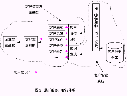 客戶智能系統(tǒng)(CI System)是本文提出的實現(xiàn)客戶智能的系統(tǒng)平臺。它包括了客戶智能體系中的信息系統(tǒng)層面、數(shù)據(jù)分析層面、知識發(fā)現(xiàn)層面,是基于客戶智能理論的可操作的系統(tǒng)框架。因此,客戶智能體系也可以簡單地用客戶智能基礎(chǔ)理論和基于客戶智能理論的客戶智能系統(tǒng)兩個邏輯層面表示(圖2);诳蛻糁悄艿腃RM系統(tǒng)是本文描述的客戶智能系統(tǒng)中的一種。