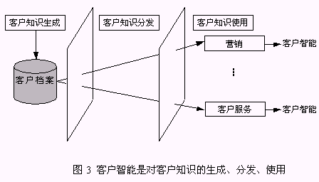 客戶知識是人們通過實踐認識到的、與客戶有關(guān)的規(guī)律性,而客戶智能是獲得客戶知識并使用客戶知識求解問題的能力?蛻糁悄苁菍ζ髽I(yè)戰(zhàn)略決策真正有價值的事物和行動?蛻糁悄懿粌H包括了客戶知識的生成,而且更強調(diào)了客戶知識在企業(yè)中的分發(fā)、使用,直到產(chǎn)生客戶智能。所以,客戶智能是對客戶知識的生成、分發(fā)和使用(圖3)。
