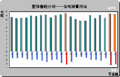 從前面分析可知,易趣以19.77%的比例成為最不喜歡在線銷售網(wǎng)站,選擇被調(diào)查者對子流程評分——最喜歡、最不喜歡在線銷售網(wǎng)站滿意度曲線與重要性曲線進行差距分析。