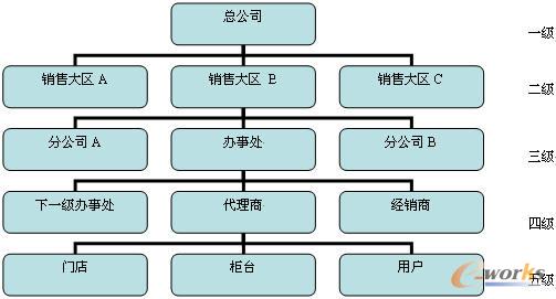 目前國內(nèi)企業(yè)分銷網(wǎng)絡(luò)層次最多可達到五層,如圖1所示。最上層是營銷總部,第二層是銷售大區(qū),第三層是各地分公司、辦事處,第四層是各地辦事處、代理商和經(jīng)銷商,第五層是用戶或門店。