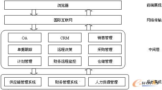 中間層:是實現(xiàn)具體的應(yīng)用功能的層次,包括銷售、采購、倉儲管理、遠程審批/監(jiān)控/決策等;