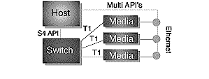 使用TAPI、S.100和H.100規(guī)格,服務(wù)點的主機(jī)、交換和媒體資源能有效的集成到一個交換平臺中(見圖三)早期的集成結(jié)構(gòu)受非冗余備份交換的限制,不能滿足服務(wù)供應(yīng)商的需求。S.100和TAPI也不能滿足諸如處理器冗余備份和資源分布的要求,應(yīng)用于PC平臺的H.100標(biāo)準(zhǔn)也不支持“無信號點的故障“(no signal point of failure)的載體需求。而Sigma計劃的支持全標(biāo)準(zhǔn)兼容性克服了這些限制。