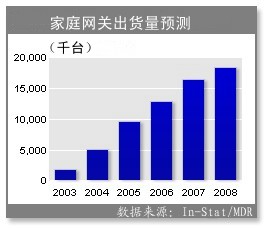 In-Stat/MDR分析師Mike Wolf說,未來5年家庭網(wǎng)關(guān)市場將推動寬帶CPE市場增長。市場將從2004年出貨低于500萬臺增長到2008年超過1800萬臺,年增長率30%。
