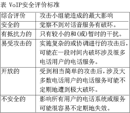 測試結(jié)果表明,采用了復(fù)雜攻擊手段的攻擊小組無法破壞思科公司的VoIP網(wǎng)絡(luò),甚至無法對其造成顯著的干擾。這套精心制造的IP電話系統(tǒng)(包括第二層和第三層基礎(chǔ)設(shè)施以及各式各樣的附加安全軟件)是“安全的”(參見表中所示的VoIP安全評價標(biāo)準(zhǔn)),它最大限度地全面發(fā)揮了思科公司的網(wǎng)絡(luò)安全專長,利用了思科公司擁有的每一種防御武器。