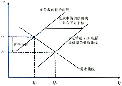 與傳統(tǒng)以電路交換為主的電話網(wǎng)相比,分組交換技術(shù)使得提供IP電話或VoIP電話所需的交換設(shè)備數(shù)量大大減少,而且部分提供IP電話或VoIP電話的運營商并沒有鋪設(shè)上下行用戶端的“最后一公里”線路。由于沒有全程布網(wǎng),在網(wǎng)間結(jié)算費較低甚至不結(jié)算的情況下,其運營成本自然遠(yuǎn)低于本地運營商,從而使其供給曲線與本地運營商的供給曲線相比向右下方偏移,因而有能力推出價格遠(yuǎn)低于傳統(tǒng)語音的IP電話或VoIP電話,見圖2。
