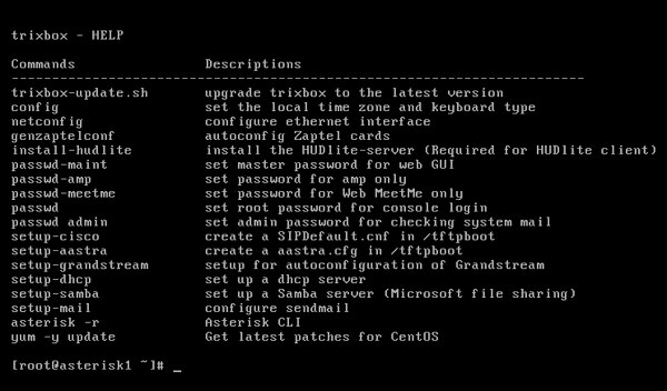 理論上,在安裝完成之后,用戶即可通過Web界面進(jìn)行配置,但是我們強(qiáng)烈建議用戶首先登錄進(jìn)入命令行界面,修改各組件相關(guān)的各個(gè)口令。使用help-trixbox功能,即可訪問Trixbox主要組件的管理、升級(jí)、維護(hù)和配置腳本,如圖1所示。其中,以“passwd”為開始的命令用于修改各主要管理界面的口令。此外,對(duì)于安裝了FXS/FXO語(yǔ)音卡的用戶,需要首先運(yùn)行g(shù)enzaptelconf腳本,生成基本的zaptel配置文本。需要提醒的是,用戶應(yīng)該慎用yum-update命令,因?yàn)樵撁钪粚?duì)CentOS進(jìn)行常規(guī)更新,有可能會(huì)改變Asterisk相關(guān)的配置文件,使Asterisk在系統(tǒng)重新啟動(dòng)之后無(wú)法正常運(yùn)行。