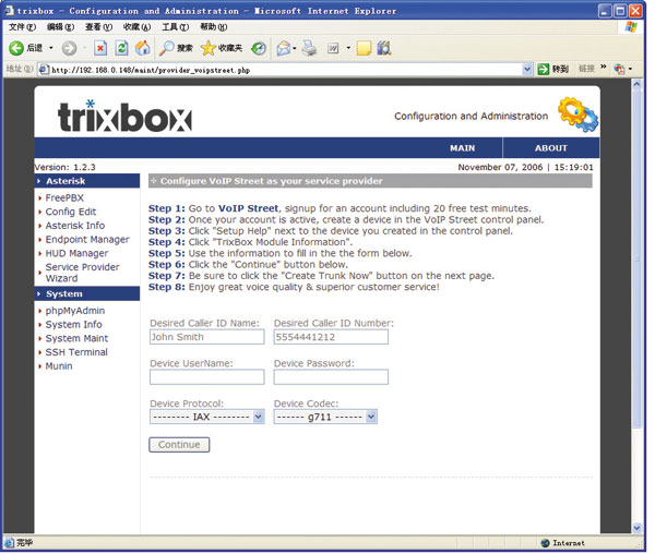 值得一提的是,得到我們極力推薦的Trixbox竟是一個(gè)新產(chǎn)品,它的出現(xiàn)至今不足半年,當(dāng)然,提到它的前身Asterisk@Home(簡(jiǎn)稱AAH),會(huì)有不少人聽說過。如今,Trixbox的官方發(fā)布版本是1.2.3,我們的測(cè)試正是基于該版本進(jìn)行。