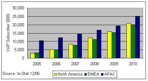 應(yīng)該說在2006年,VoIP技術(shù)已經(jīng)不是阻礙其市場發(fā)展的主要因素,因為In-Stat在全球個人VoIP消費市場中作的調(diào)查顯示,約9%的VoIP用戶甚至不清楚自己在使用IP傳輸;有64%的用戶在使用免費的VoIP服務(wù)。其次有超過73%的用戶并不把是否使用IP技術(shù)當(dāng)成選擇該業(yè)務(wù)的影響因素。而寬帶接入市場的競爭則構(gòu)成了VoIP發(fā)展的關(guān)鍵因素,作為一種寬帶應(yīng)用,誰的接入資源占據(jù)了用戶家庭,誰就可以決定是否采用VoIP技術(shù)來提供語音業(yè)務(wù)。在歐洲法國Free Telecom與意大利的FastWeb都是三重播放業(yè)務(wù)的積極推進(jìn)者,在VoIP市場居領(lǐng)先地位;在日本Yahoo!BB擁有亞洲地區(qū)50%的寬帶VoIP用戶。幾乎所有這些寬帶ISP提供商往往采用包月的形式或者以極低的費用提供無限制的本地或國內(nèi)通話,在國際長途電話上提供極大的折扣。