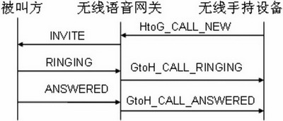 當用戶通過無線手持設備撥打一個號碼時,無線手持設備將發(fā)送一個HtoG_CALL_ NEW的內部會話信令連同呼叫的號碼給無線語音網關,無線語音網關收到該信令后,將根據(jù)該信令構造相應的SIP消息并發(fā)送到外部網絡。當無線語音網關收到來自被叫方表示振鈴信息的暫時應答RINGING時,將發(fā)送一個GtoH_CALL_RINGING的內部會話信令給手持設備。當無線語音網關收到來自被叫方表示應答的信息ANSWERED時,語音網關將啟動RTP線程并發(fā)送一個GtoH_CALL_ANSWERED的內部會話信令給手持設備以通知被叫方已應答。此時手持設備開啟語音進程,與被叫方實現(xiàn)通話。
