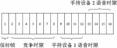 根據(jù)設計的特點,無線語音網關同手持設備間的無線網絡采用星型拓撲結構,無線語音網關作為無線個域網的協(xié)調器同手持設備進行信息交互。IEEE802.15.4MAC層分為使用信標幀和不使用信標幀兩種工作模式,本設計采用使用信標幀同步的超幀結構,由無線語音網關發(fā)送信標幀同步無線手持設備的數(shù)據(jù)傳輸。本設計中超幀長30ms,等分為16個時隙,每個時隙為1.875ms。信標幀在時隙1發(fā)送,時隙2到時隙8為競爭時隙,使用時隙CSMA-CA算法傳輸命令幀和應答幀。時隙9到時隙16固定分配給兩個手持設備作為上下行語音數(shù)據(jù)通道。上下行各兩個時隙的分配可以滿足經