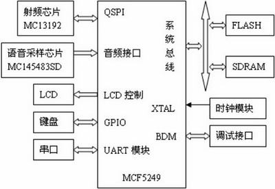 除內核外,完整的操作系統(tǒng)還需要編寫鍵盤,LCD,音頻驅動和射頻芯片驅動。音頻驅動采用Phlips I2S數(shù)據(jù)格式,設定采樣率為8KHz。射頻芯片驅動采用Freescale公司為MC13192提供的配套軟件模塊。