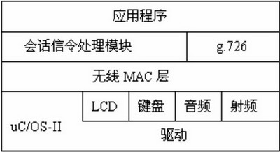 操作系統(tǒng)之上是無線MAC層,該模塊針對語音無線傳輸?shù)奶攸c簡化實現(xiàn)了IEEE 802.15.4 協(xié)議MAC層功能。第三層為語音壓縮編解碼g.726模塊和無線網內部會話信令處理模塊。會話信令處理模塊負責處理來自無線語音網關的會話信令。最上層為應用層,實現(xiàn)用戶界面和通話過程控制。無線手持設備總統(tǒng)框架如圖6所示。