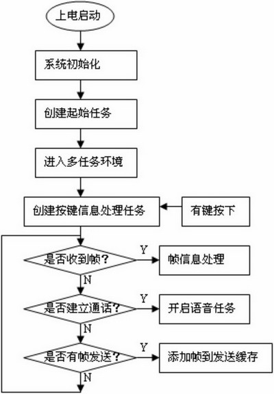 當手持設備上電啟動后,其工作流程如圖7示。首先進行的是系統(tǒng)的初始化,包括處理器初始化,操作系統(tǒng)mC/OS-II初始化,LCD,鍵盤,射頻模塊等的初始化。之后建立起始任務并通過OSStart()函數(shù)進入多任務環(huán)境。此時起始任務占用CPU資源,在起始任務中,建立按鍵信息處理任務并通過信號量機制掛起。然后判斷是否收到來自無線語音網關的幀,如果有,調用frame_deal()函數(shù)處理幀信息,在該函數(shù)中調用call_command_deal()完成無線網內部會話信令的處理。接著判斷通話是否建立,如果建立則創(chuàng)建語音任務,在語音進程中使能PCM編解碼芯片,并進行g.726壓縮編碼。最后判斷是否有幀需要發(fā)送給無線語音網關,如果有則把幀添加到發(fā)送緩存,等待發(fā)送時隙到來。這一過程完成以后重新跳到判斷是否收到來自無線語音網關的幀,重復以上過程。如果有鍵盤中斷,將會釋放一個信號量,該信號量將解掛按鍵信息處理任務。該任務對鍵盤輸入信息進行處理。