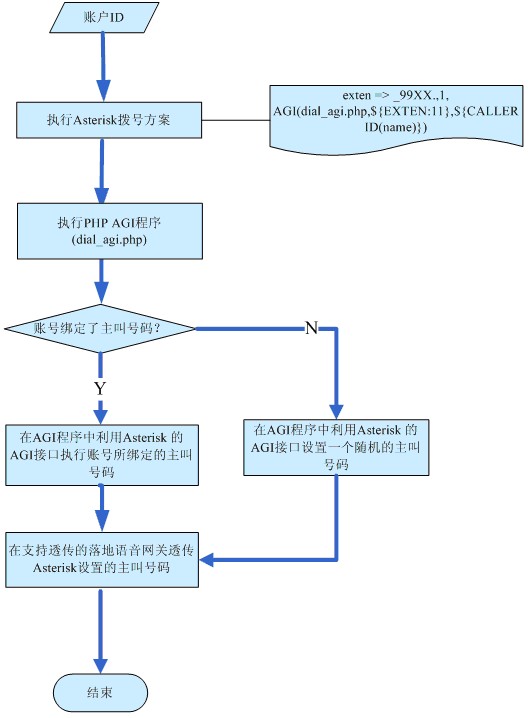 圖2Asterisk 主叫號(hào)碼透?jìng)鞯暮笈_(tái)PHP AGI流程圖