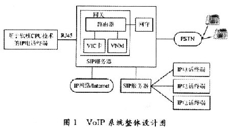通過對國內(nèi)外VoIP技術(shù)的研究,要面向社會推廣價格低廉的IP電話業(yè)務(wù),普通用戶的電話終端成本,運(yùn)營商的設(shè)備、管理成本都是必須考慮的因素。因此,設(shè)計(jì)出了一個VoIP系統(tǒng)方案,如圖1所示。