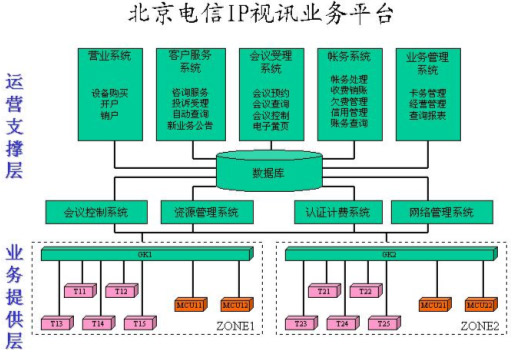 在整個(gè)運(yùn)營(yíng)支撐層的系統(tǒng)中,主要包括四大系統(tǒng),即會(huì)議控制系統(tǒng)、資源管理系統(tǒng)、認(rèn)證計(jì)費(fèi)系統(tǒng)、網(wǎng)絡(luò)管理系統(tǒng)。除此之外,還有其它幾個(gè)輔助系統(tǒng),包括營(yíng)業(yè)系統(tǒng)負(fù)責(zé)為客戶開戶和銷戶,終端注冊(cè)等處理;客戶服務(wù)系統(tǒng)提供咨詢服務(wù)、投訴受理、自動(dòng)查詢和幫助客戶進(jìn)行會(huì)議預(yù)約,在資源不足的情況下進(jìn)行會(huì)議調(diào)度等;會(huì)議受理系統(tǒng)是面向客戶提供會(huì)議電視業(yè)務(wù)預(yù)約、會(huì)議狀態(tài)查詢、會(huì)議控制服務(wù),由用戶自助完成預(yù)約會(huì)議和控制會(huì)議的操作;賬務(wù)系統(tǒng)負(fù)責(zé)賬務(wù)方面的管理,包括賬務(wù)管理,收費(fèi)銷賬,催繳欠費(fèi)、銀行繳費(fèi)等;業(yè)務(wù)管理系統(tǒng)主要是記賬卡的卡務(wù)處理、經(jīng)營(yíng)管理、查詢報(bào)表等。