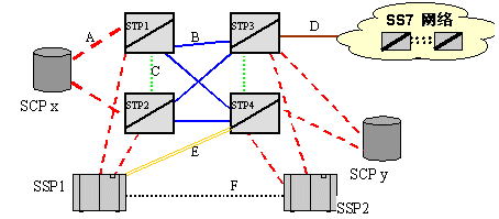 下圖顯示了各種類型的鏈路,各種類型的鏈路在物理上都是DS1或T1或E1中的一個(gè)時(shí)隙。這些鏈路類型 的定義和具體連接兩節(jié)點(diǎn)的鏈路配置有關(guān),定義這些鏈路類型的目的,是為了更好地管理網(wǎng)絡(luò),特別是為了減少網(wǎng)絡(luò)中斷的可能。為了提高網(wǎng)絡(luò)的可靠性,必需要有多個(gè)通道可以傳送消息。在ANSI和ITU-T的標(biāo)準(zhǔn)里,都有相應(yīng)的規(guī)則說明如何通過各種類型的鏈路傳遞消息,(如下圖所示的網(wǎng)絡(luò)中,當(dāng)從SSP1往SSP2發(fā)消息時(shí),首先試圖從A鏈路發(fā)送消息,如果消息發(fā)送不出去,再試從F鏈路發(fā)送)。以及如何避開網(wǎng)絡(luò)瓶頸傳遞消息。
