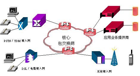 未來的網(wǎng)絡(luò)將會以基于數(shù)據(jù)包的網(wǎng)絡(luò)為核心,交換系統(tǒng)以IP交換和ATM交換等構(gòu)成,能實(shí)現(xiàn)包括語音、數(shù)據(jù)和視頻的所有交換需求。各種接入網(wǎng),如:無線網(wǎng)、有線電纜網(wǎng)、DSL、TDM(時分多路復(fù)用)交換網(wǎng)等,通過路由器接入到核心網(wǎng)絡(luò)。