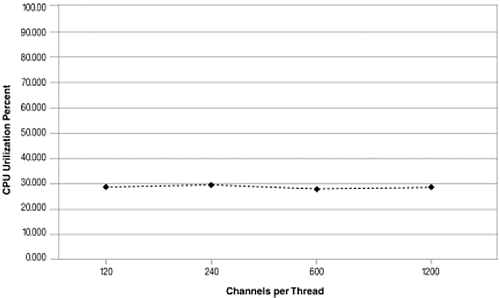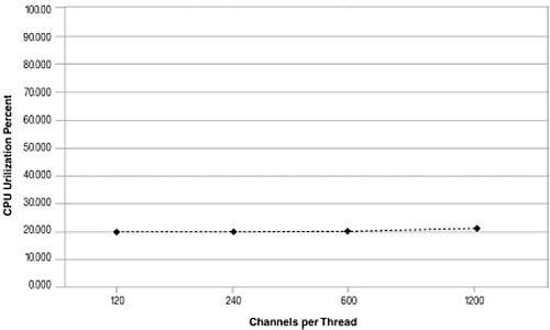 擴(kuò)展異步模式使用了36%到28%. 系統(tǒng)顯示了很高的擴(kuò)展性, CPU使用率和通道數(shù)成線(xiàn)形增長(zhǎng).