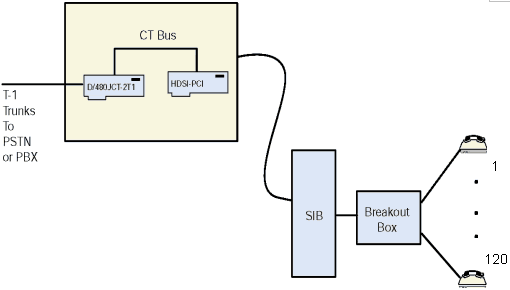 Bus,一個HDSI/1200座席卡可以連接到一個Dialogic® Dialogic® D/480JCT-2T1板卡和一個T-1板卡,建立一個120-station-×-48-trunk交換環(huán)境。應用可以使用CT
