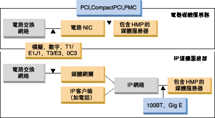 模塊化的下一代網(wǎng)絡(luò)將語音和數(shù)據(jù)合并在單個包基礎(chǔ)結(jié)構(gòu)中。這使目前的兩種主要架構(gòu)可用于部署媒體服務;基于直通電路的網(wǎng)絡(luò)接口和基于包的IP網(wǎng)絡(luò)接口。下面的圖說明了這兩種架構(gòu)。Dialogic HMP軟件可在這兩種架構(gòu)中提供媒體處理。
