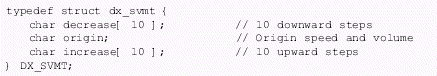 。。速度/音量調(diào)節(jié)表(DX_SVMT)數(shù)據(jù)結(jié)構(gòu)有21個代表不同級別的速度和音量的條目,用于指定信道的速度或者音量調(diào)節(jié)的變化率。這些值可以設(shè)置或者用dx_setsvmt()和dx_getsvmt()從表中取值。